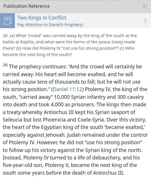 30 Military forces under Ptolemy V, or “arms of the south,” succumbed to assault from the north. At Paneas (Caesarea Philippi), Antiochus III drove Egypt’s General Scopas and 10,000 select men, or “picked ones,” into Sidon, “a city with fortifications.” There Antiochus III ‘threw up a siege rampart,’ taking that Phoenician seaport in 198 B.C.E. He acted “according to his will” because the forces of the Egyptian king of the south were unable to stand before him. Antiochus III then marched against Jerusalem, the capital of “the land of the Decoration,” Judah. In 198 B.C.E., Jerusalem and Judah passed from domination by the Egyptian king of the south to that of the Syrian king of the north. And Antiochus III, the king of the north, began to “stand in the land of the Decoration.” There was “extermination in his hand” for all opposing Jews and Egyptians. For how long would this king of the north be able to do as he pleased?